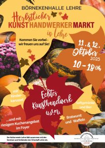 Gemeinsam mit den Vereinen und Verbänden der Ortschaft Lehre lädt der Kulturverein nun schon zum sechsten Mal zum Lehrscher Kunsthandwerkermarkt ein. Das lebendige Treiben findet am 11. und 12. Oktober 2025 rund um die Börnekenhalle von 10 Uhr bis 18 Uhr statt. Selbstverständlich steht für die Kleinsten auch wieder das Kinderkarussell zur Verfügung.