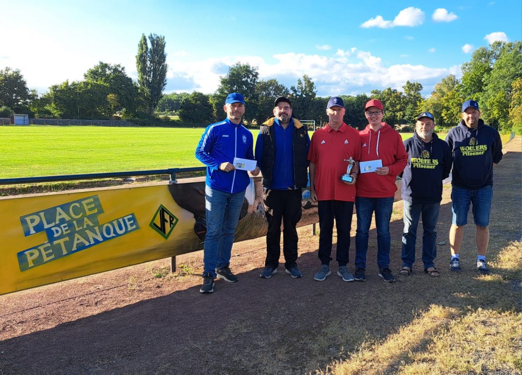 Nach Auswertung der Spielergebnisse führten Thomas Henke und Torsten Boog die Siegerehrung durch. Die Sieger erhielten den von unserem Vereinsmitglied Uwe Porth gestifteten Wanderpokal. Für die Plätze 1–10 wurde außerdem ein Teil der Startgebühren als Preisgeld ausgeschüttet. Der Wanderpokal ging in diesem Jahr nach Innerstetal, denn die Gewinner der 7. Weddeler Boulemeisterschaft sind unsere Boulefreunde Cay Garbrecht und Gilles Guerne aus Innerstetal. Den 2. Platz belegten Jens Koeppe und Sebastian Socha von den Magniboulern. Es freut uns Weddeler Bouler natürlich besonders, dass der 3. Platz von Achim und David Rybakowski aus Weddel erkämpft worden ist. Thomas verband seine Abschiedsworte mit der Hoffnung, dass auch im nächsten Jahr noch mehr Boulefreunde an der dann inzwischen schon 8. Weddeler Boule-Meisterschaft teilnehmen werden.