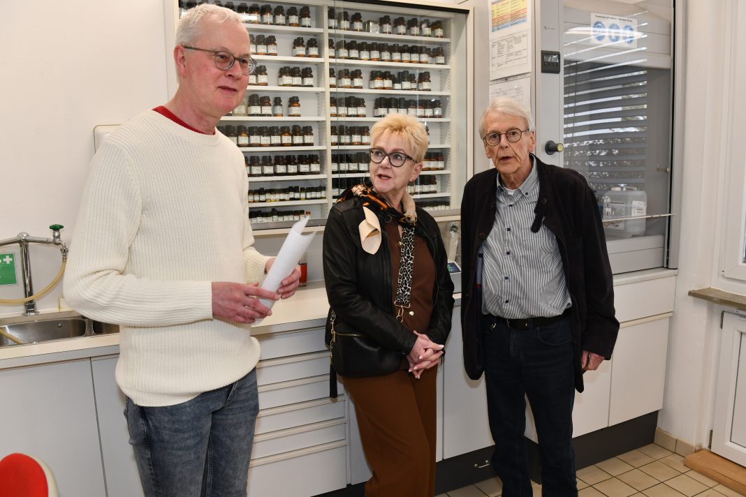 Bildunterschrift: Apotheker Thomas Sieverding (links) zeigt Michael Schwarze (rechts), CDU-Ratsmitglied und Ortsbürgermeisterkandidat für Weddel, und CDU-Ortsrätin Anke Ilgner das Labor, das „Herzstück“ der Weddeler Buchhorst-Apotheke.