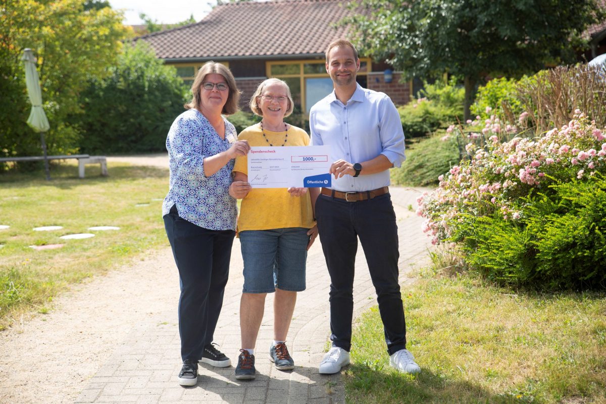 Marcel Hanschke aus der Geschäftsstelle der Öffentlichen in Cremlingen übergibt die Spende an Sabine Eggeling, stellvertretende Leiterin der Wohnstätte Cremlingen der Lebenshilfe Braunschweig (links). Ilse-Marie Michel (Mitte) hat bei einem Gewinnspiel der Öffentlichen teilgenommen und sich eine Spende für Ausflüge der Wohngruppe D in Cremlingen gewünscht