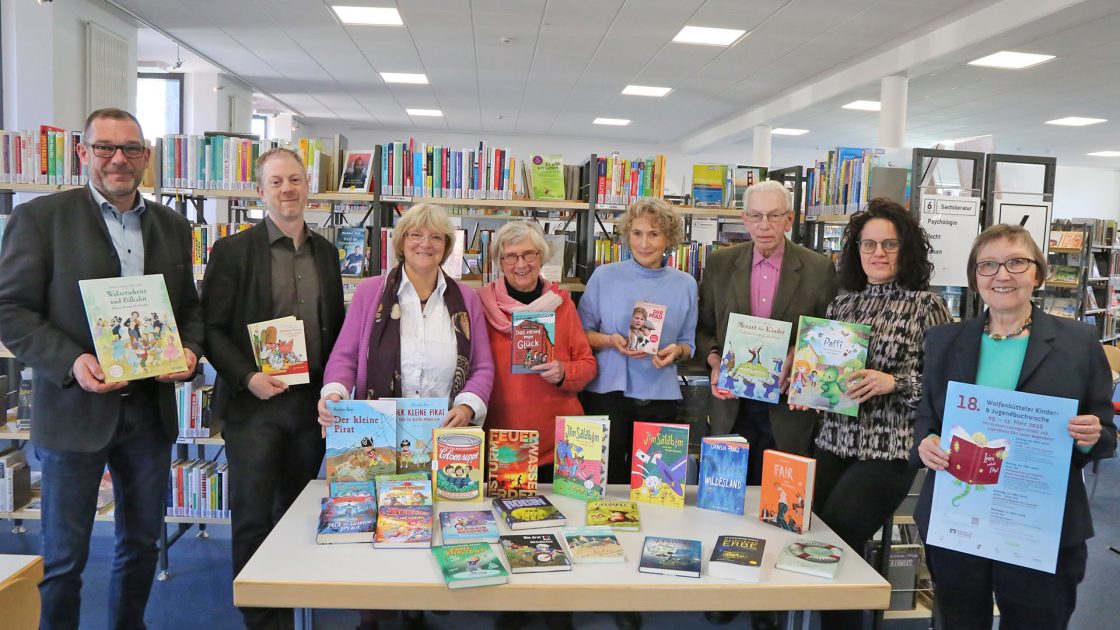 Foto: Von links: Andreas Jung (Volksbank), Timo Abert (Avacon), Regina Ernst, Christine Schrader, Gabriela Zaremba, Manfred Wuttke, Daniela Bergmann-Baczynski (Stadtbücherei) und Ille Schneider freuen sich auf die kommende Kinder- und Jugendbuchwoche in Wolfenbüttel. Foto: Stadt Wolfenbüttel