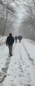 Nach einer kurzen Begrüßung durch Ortsbrandmeister Joachim Rentsch begab sich die Gruppe auf eine etwa acht Kilometer lange Wanderstrecke durch die heimische Landschaft der Asse. Bei winterlichen Bedingungen führte der Weg über Wald- und Feldwege, die stellenweise matschig waren und noch Schnee aufwiesen.