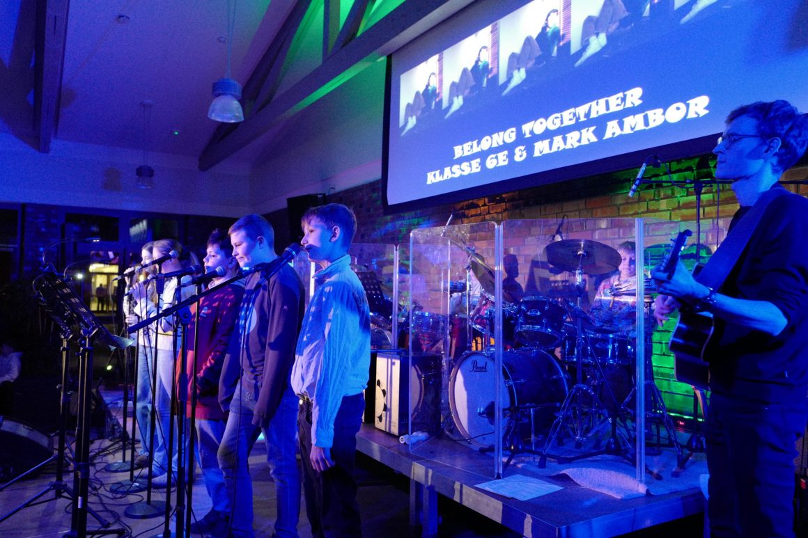 Foto: Sängerinnen, Sänger und Musizierende der Klasse 6e präsentieren ihren Titel „Belong Together“ von Mark Ambor auf dem Musischen Abend der OBS Sickte; rechts im Bild begleitet der musikalische Leiter des Abends, Musiklehrer Felix Warnke Fotos: OBS/privat