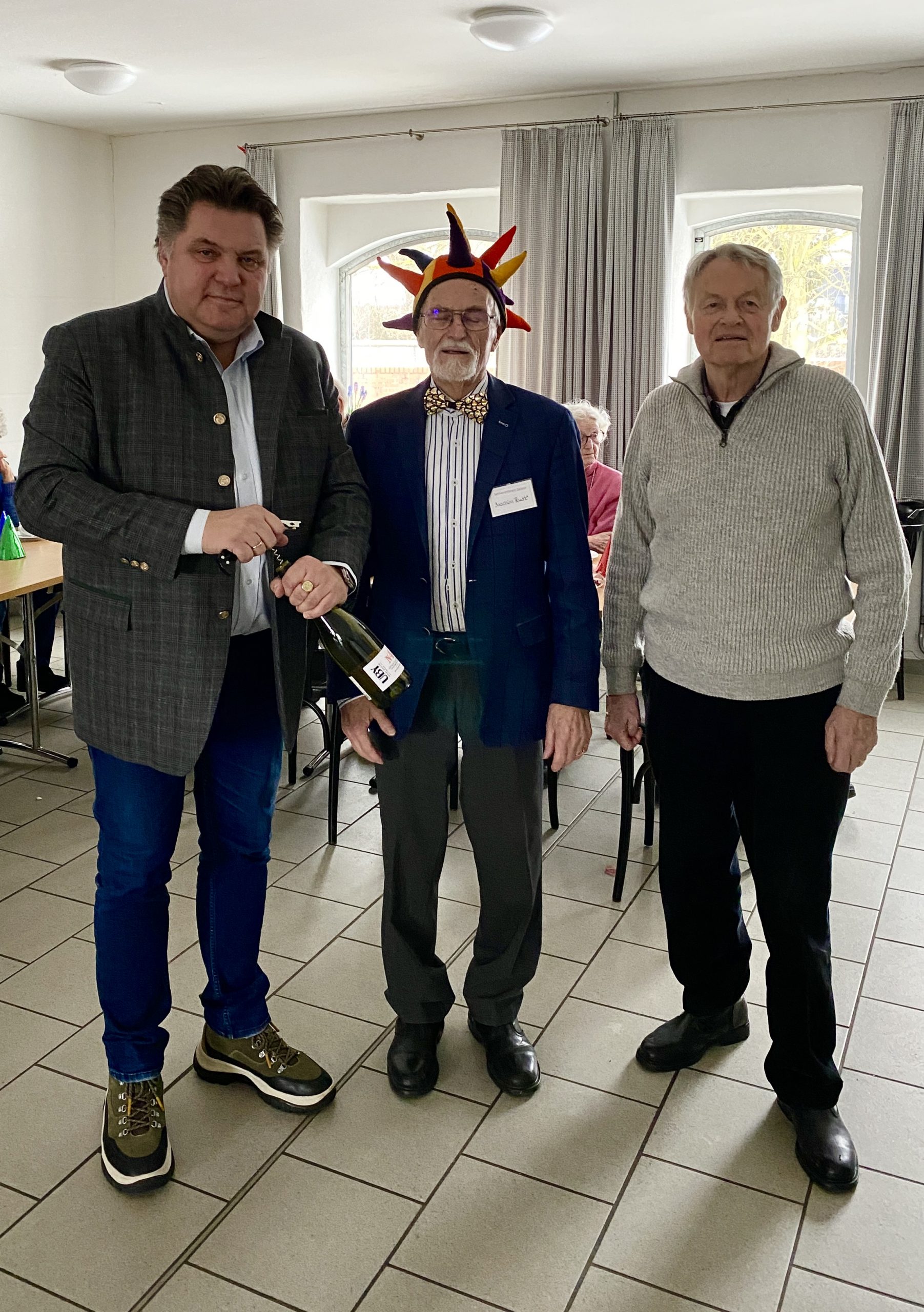 Weinprobe mit Karnevalsstimmung: Joachim Rust (Mitte ) bedankte sich bei Uwe Schäfer(links, CDU) und Dr.Manfred Bormann (rechts,CDU) für die informative Weinprobe