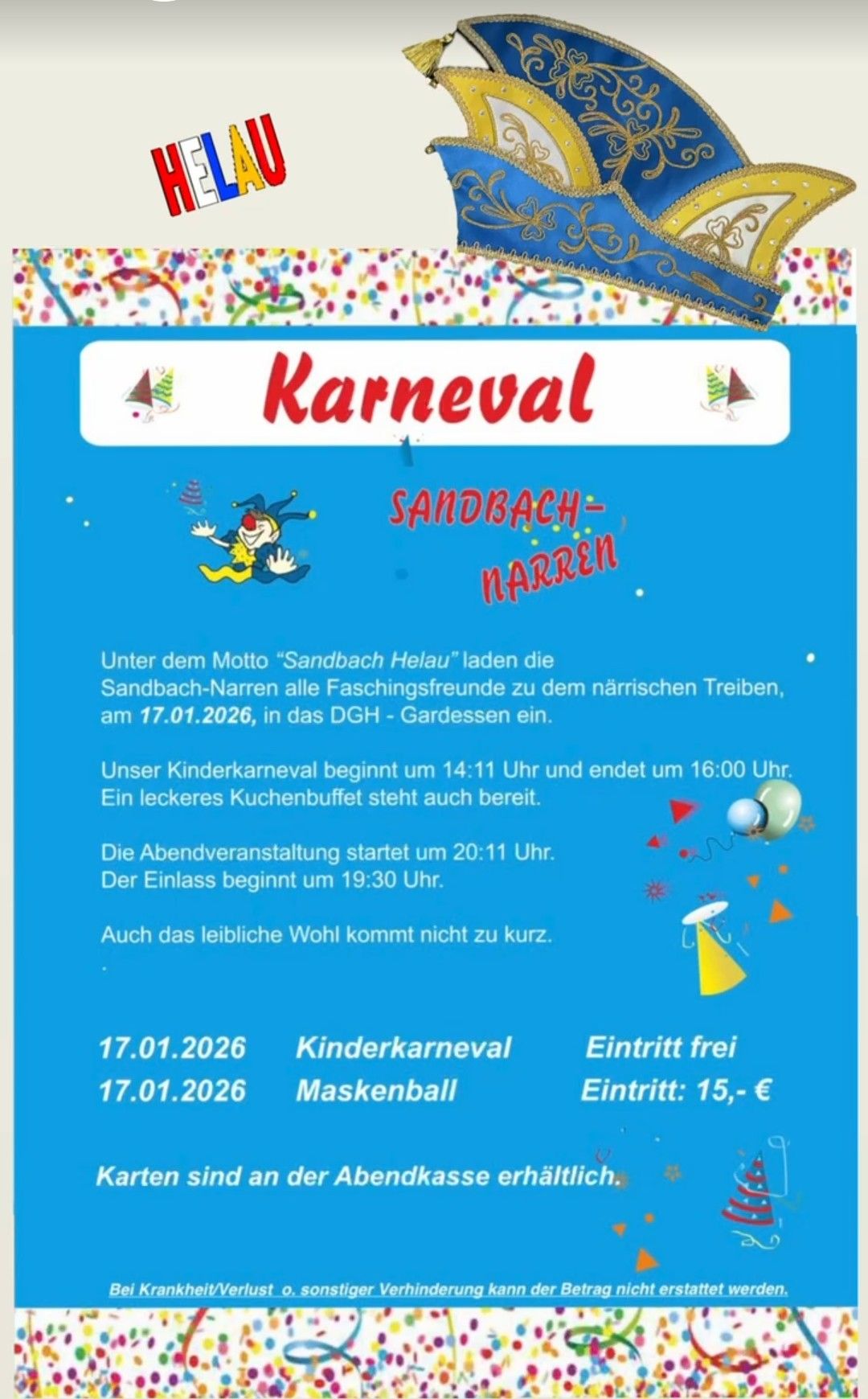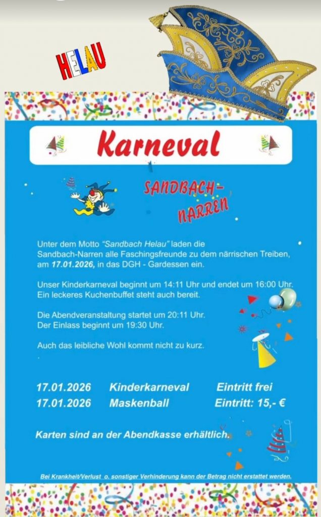 Veranstaltungen / Termine Die Sandbachnarren starten am Wochenende Von Event-Team - Jan. 16, 2026 94 FacebookTwitterPinterestWhatsApp