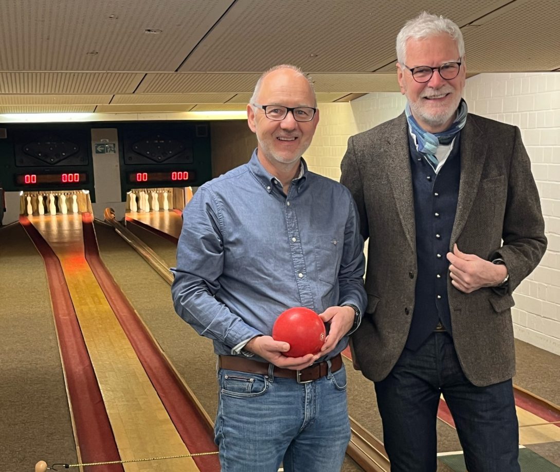 Titelfoto: Gemeindebürgermeisterkandidat Jens Drake mit Ortsbürgermeister Holger Dietze auf der Kegelbahn Abbenrode