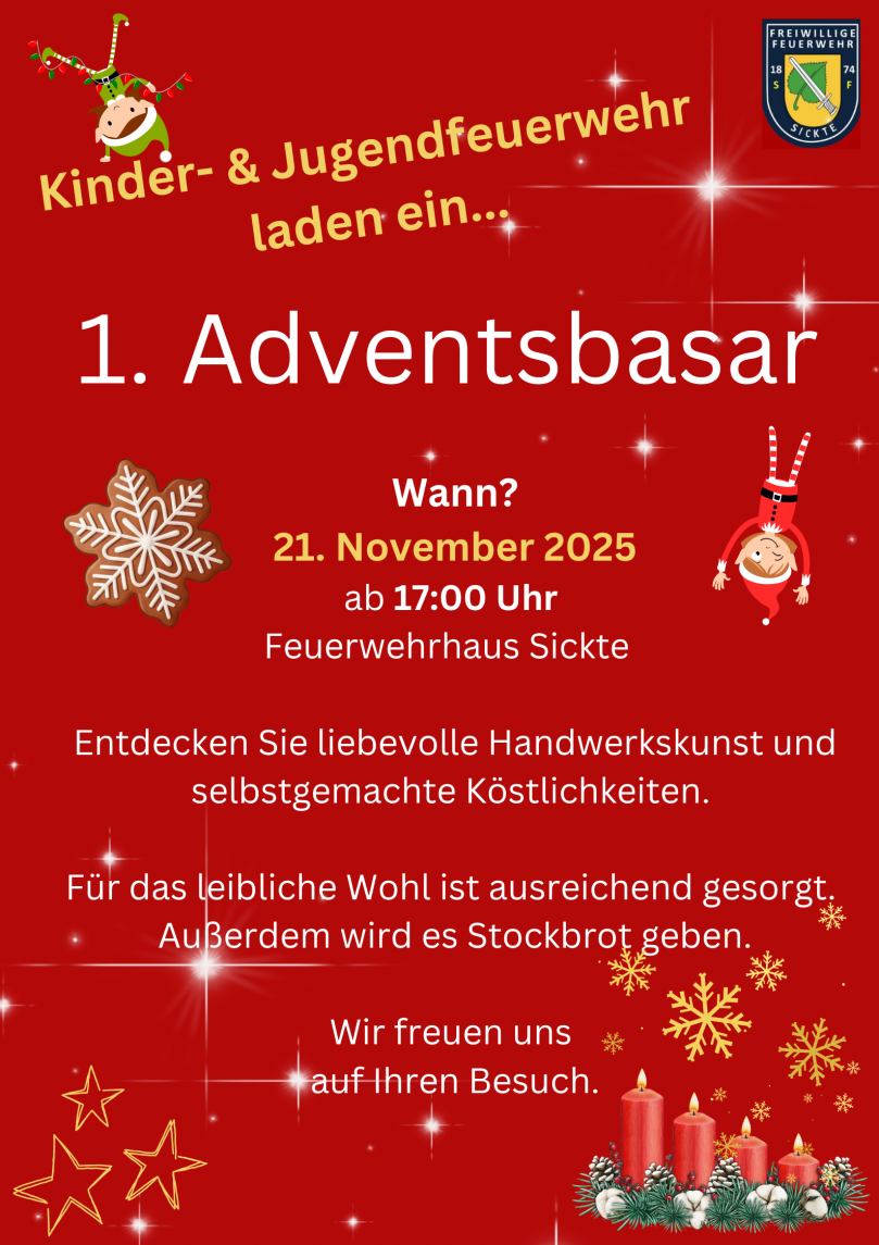 Tauchen Sie ein in eine festliche Vorweihnachtsstimmung beim ersten Adventsbasar der Kinder- und Jugendfeuerwehr Sickte. Am 21. November, ab 17:00 Uhr, öffnen sich die Tore im Feuerwehrhaus Sickte.