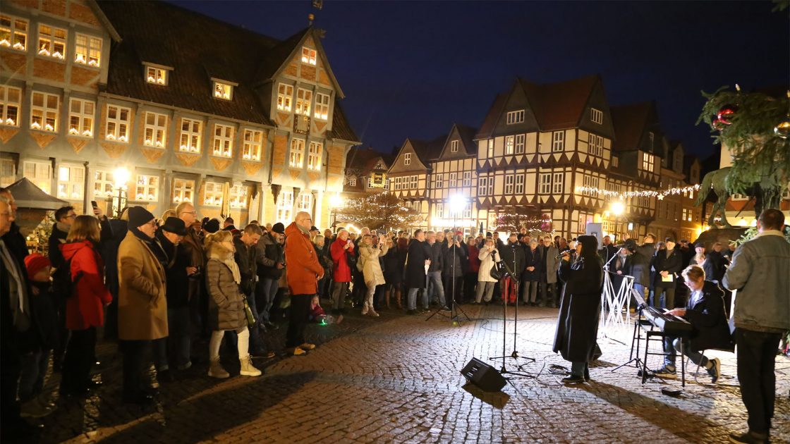 „Ich freue mich, so viele Menschen hier begrüßen zu können zu unserem heutigen Tag der Illuminierung der Friedenstanne“, betonte dann auch Krause-Willenberg bei seiner Begrüßung. „Ich hoffe, dass diese Friedenstanne mit ihrem Licht, das in die ganze Welt strahlt, dazu beiträgt, dass wir in Frieden, in Eintracht, hier auf der Welt weiterleben können. Und ich hoffe und ich denke auch, dass die Unterstützung hier in Wolfenbüttel, von den Bürgern auch da ist. Und das wollen wir heute mit der Illuminierung der Friedenstanne auch nochmal feiern.“
