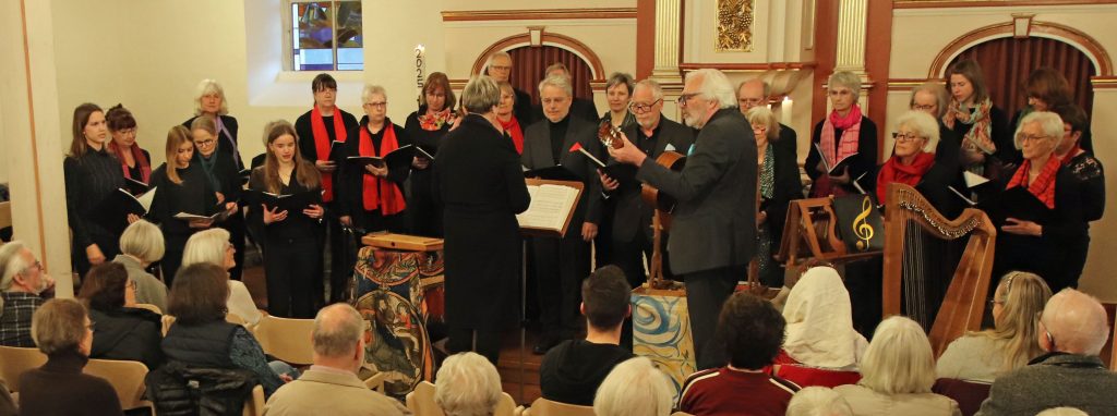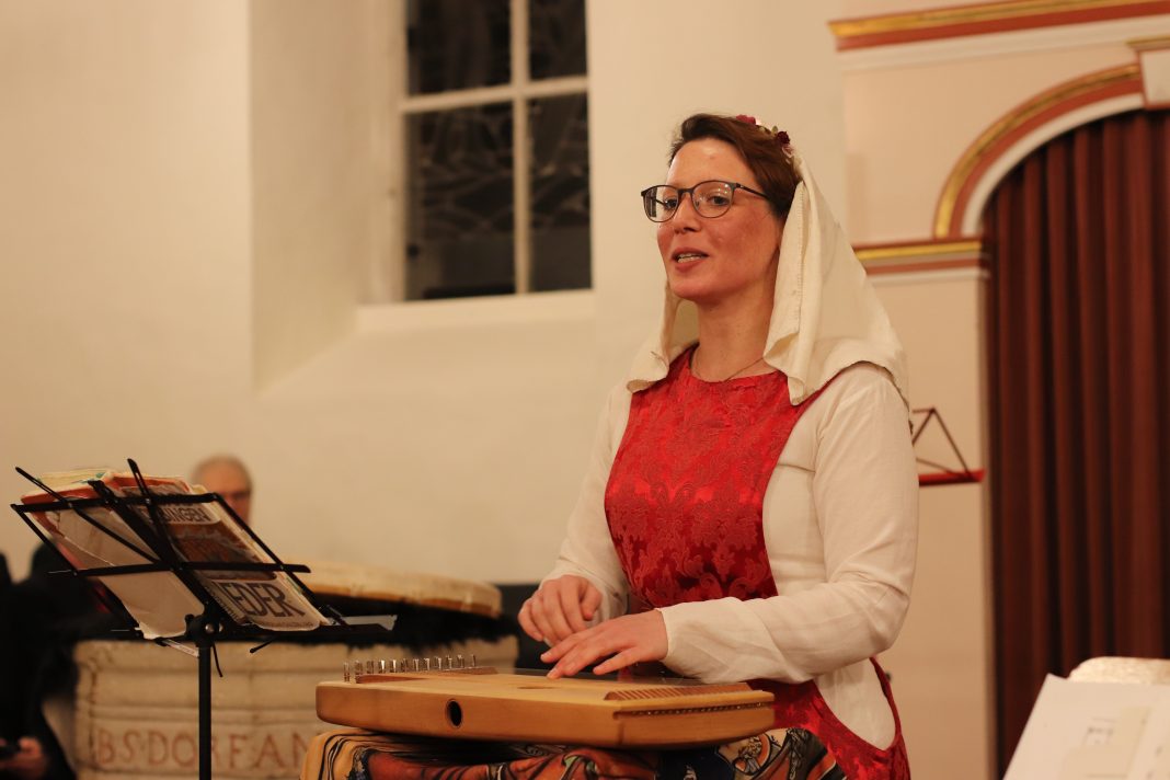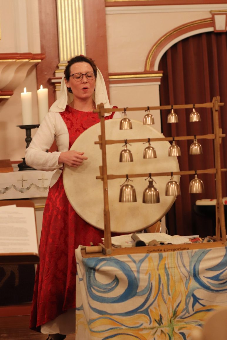 Die Besonderheit des Abends blieb aber der Anteil mittelalterlicher Musik, die Eva-Maria Karras auch in ihrer Moderation dem Publikum nahebrachte. Sie zeigte, wie farbig die einstimmigen Gesänge sein konnten, wenn sie entsprechend instrumental begleitet wurden. Ihr Vortrag wurde zu einem Gesamtkunstwerk mittelalterlicher Kunst, angefangen vom Gewand bis zum musikalischen Vortrag als solchem. Mit mehreren Saiteninstrumenten – große und romanische kleine Harfe, Monochord und dem Rebec, einem Vorläuferinstrument der heutigen Geigen -, Glocken, einer Shrutibox – eine Art Kleinakkordeon ohne Knöpfen und Tastatur aus dem indischen Raum – Trommeln und Schellenkranz bereitete Karras sich selber, aber auch im gemeinsamen Gesang mit dem Chor durch entsprechendes Anschlagen entweder rhythmische Impulse oder ein harmonisch-sphärisches Fundament aus Borduntönen, die ihre Wirkung als liegende Klangbänder entfalteten.
