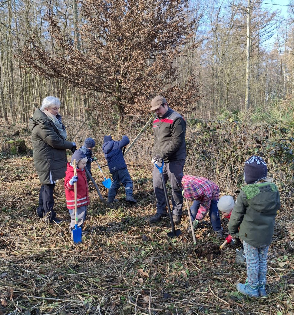 Unter fachkundiger Anleitung von Bastian Schubert, Mitarbeitender der Niedersächsischen Landesforsten, lernten die Waldkinder, worauf es beim Pflanzen ankommt – vom richtigen Abstand über das vorsichtige Einsetzen der Wurzeln bis hin zum festen Andrücken der Erde. Gepflanzt wurden unter anderem Esskastanien, Wildbirnen sowie rote und schwarze Johannisbeeren. Diese Gehölze sind nicht nur ökologisch wertvoll, sondern werden den Kindern künftig auch mit Blüten, Früchten und spannenden Naturbeobachtungen begegnen.