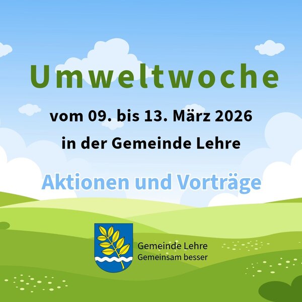 Vom 09. bis 13. März 2026 findet in der Gemeinde Lehre wieder die Umweltwoche statt. Die Gemeindeverwaltung unterstützt alle Freiwilligen mit Handschuhen und Müllbeuteln und organisiert die Entsorgung des gesammelten Mülls.