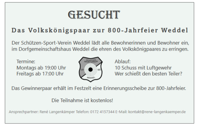 GESUCHT! Das Volkskönigspaar zur 800-Jahrfeier Weddel