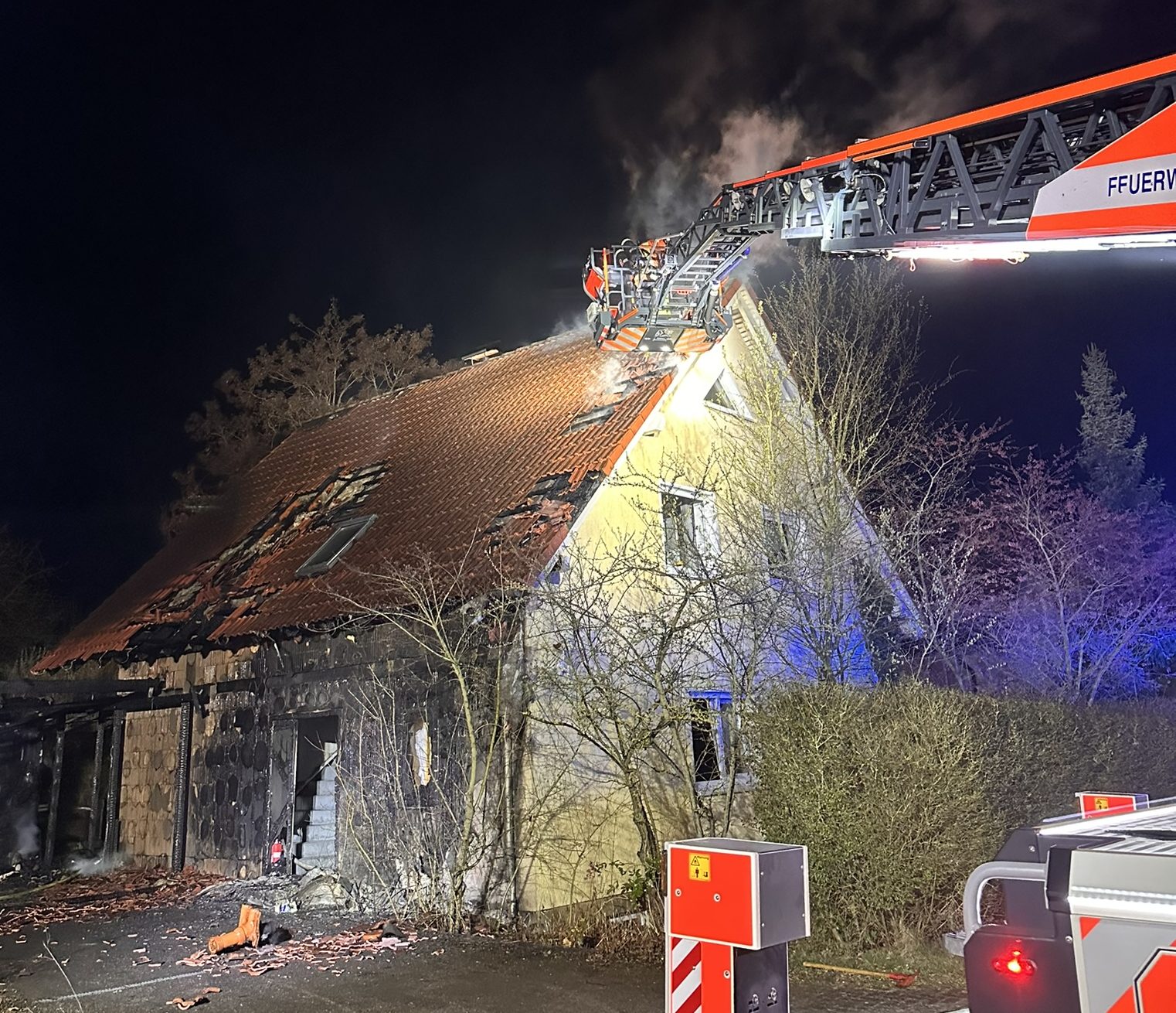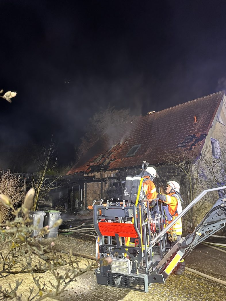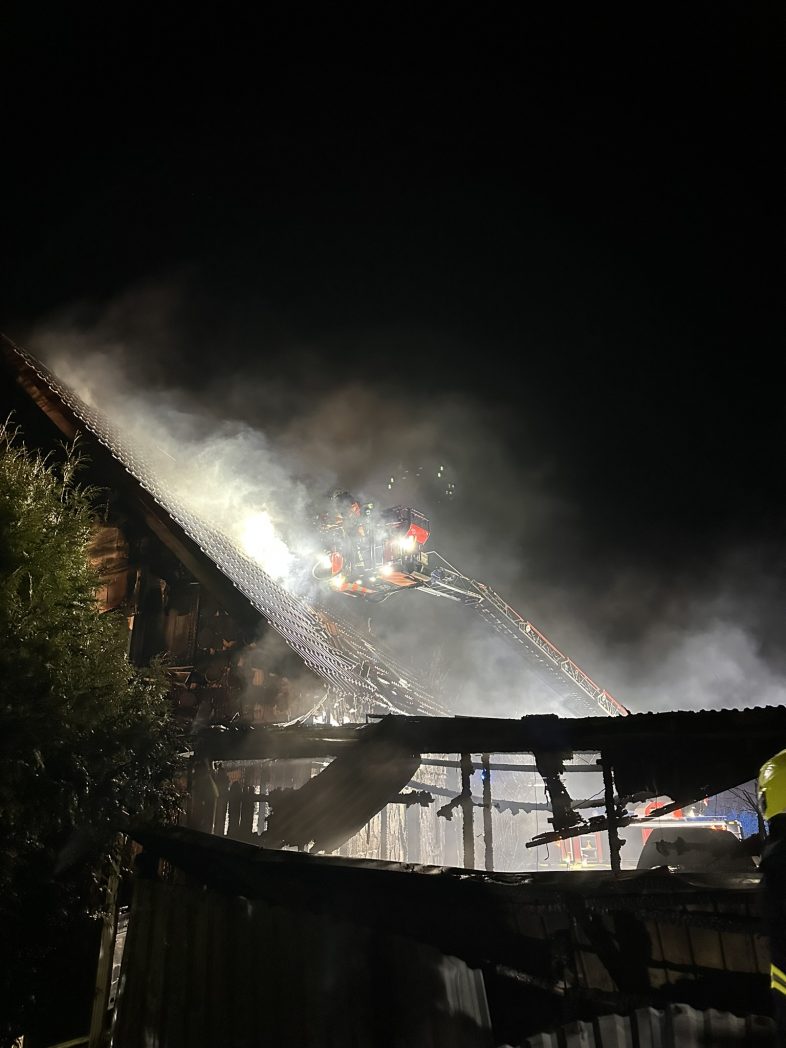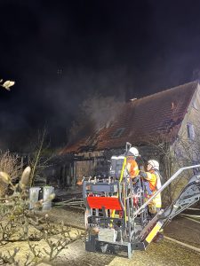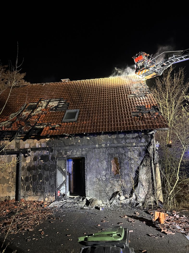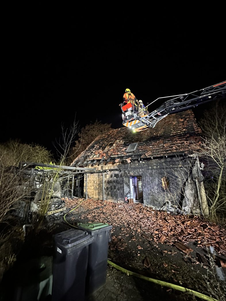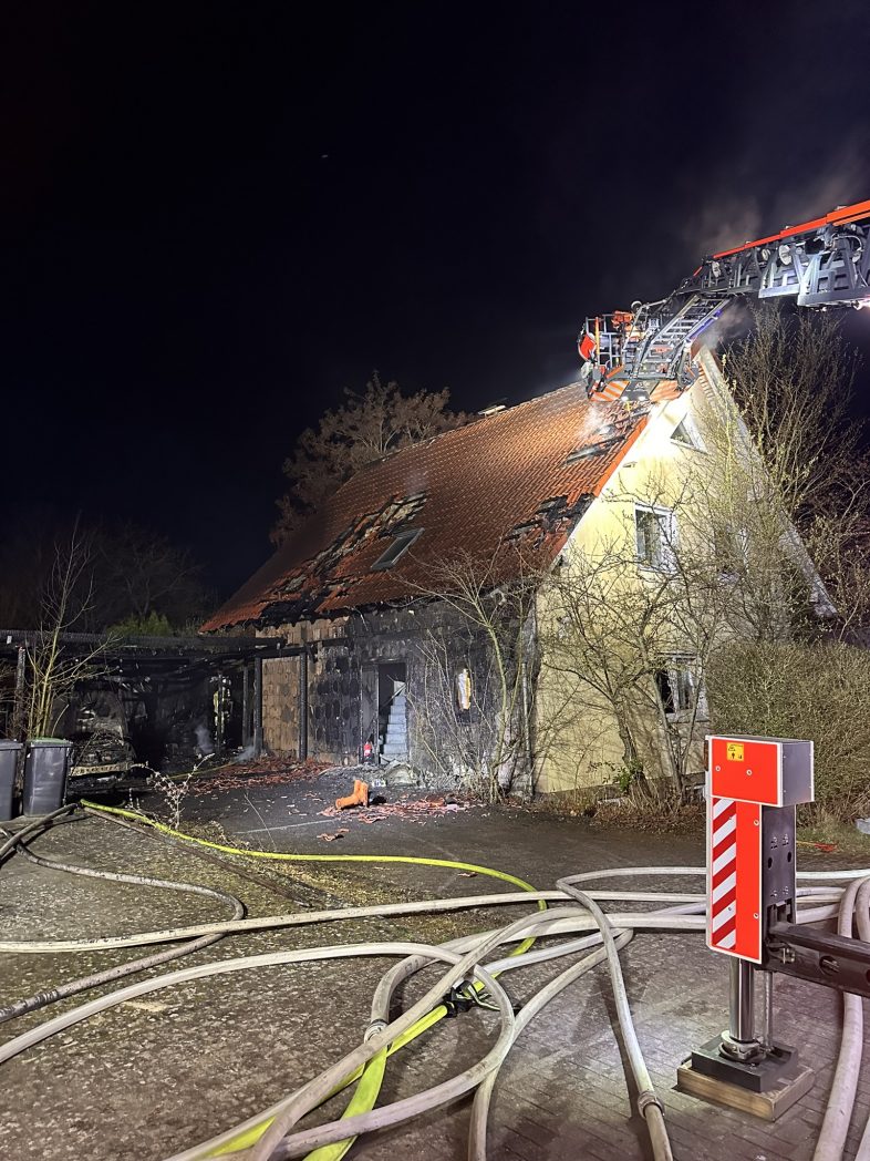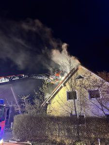 Menschen befanden sich zu diesem Zeitpunkt nicht mehr im Gebäude. Die Feuerwehr rettete mehrere Katzen und leitete umgehend eine intensive Brandbekämpfung ein. Im Einsatzverlauf wurde eine Drehleiter eingesetzt, um die Brandentwicklung im Dachbereich des Einfamilienhauses gezielt zu bekämpfen. Zur Sicherstellung der Löschwasserversorgung wurde eine Schlauchleitung über 400 m verlegt.