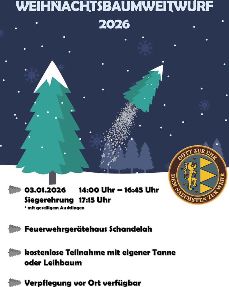 FeuerwehrenVeranstaltungen / Termine Im Januar ist wieder Weihnachtsbaumweitwurf in Schandelah Von Event-Team - Dez. 23, 2025 233 FacebookTwitterPinterestWhatsApp Am 3. Januar 2026 ist es wieder soweit: Wir starten gemeinsam mit euch beim Weihnachtsbaumweitwurf ins neue Jahr Also Kugeln runter, Kerzen aus und bringt euren Baum mit zum Gerätehaus. Los geht‘s ab 14 Uhr, für Essen und Getränke ist gesorgt.