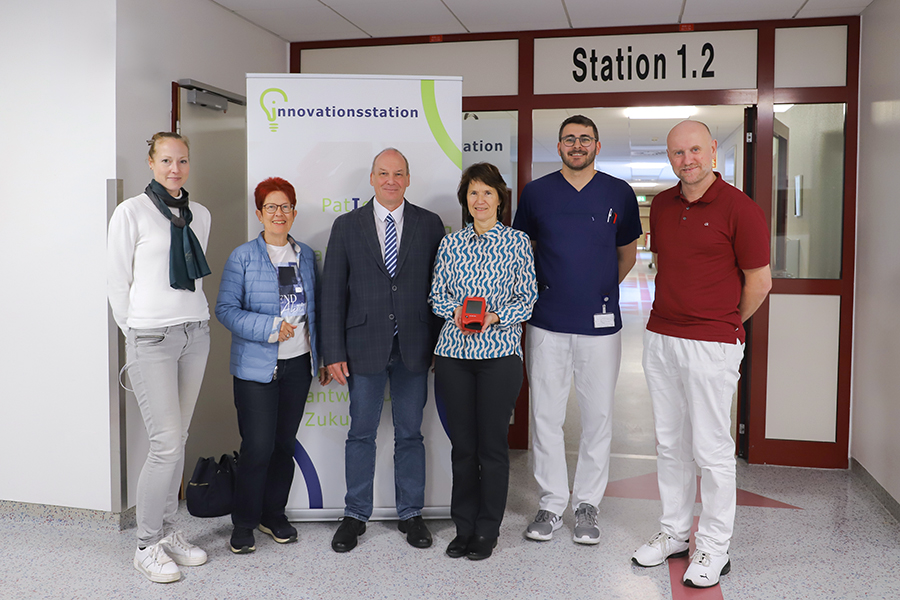 Bildunterschrift: V.l.n.r.: Wenke Lubosch, Pflegedirektorin, Dörthe Weddige-Degenhard, Vorsitzende des Fördervereins, Olaf Ruczkowski, Heike Ruczkowski, Philipp Sonar, Leiter Innovationsstation, und Dr. Tobias Jüttner, Ärztlicher Direktor. Foto: Städtisches Klinikum Wolfenbüttel