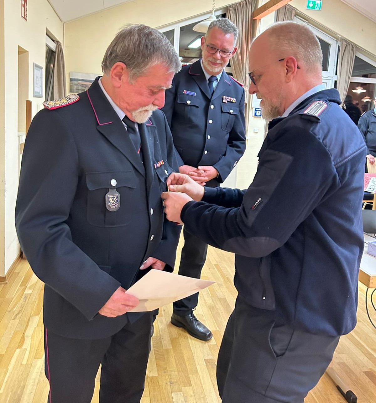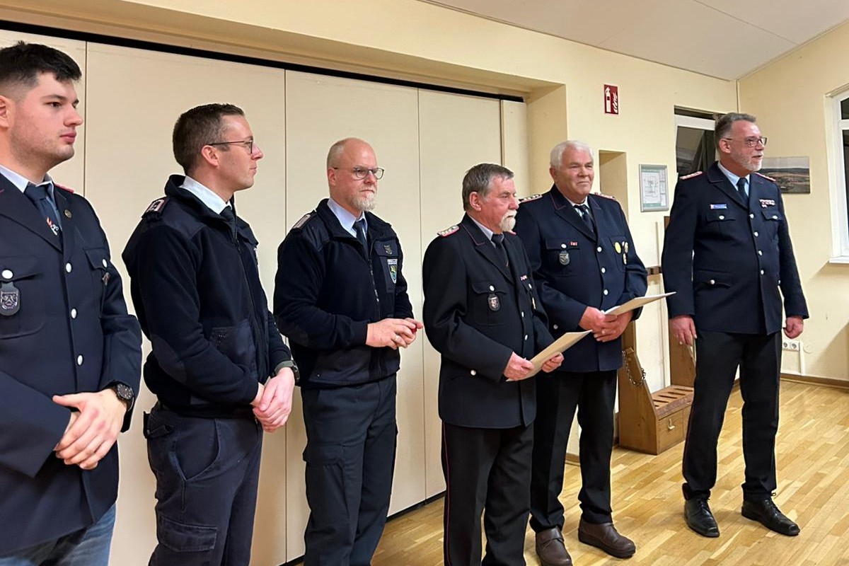 Auch Beförderungen und Ehrungen standen auf der Tagesordnung der Versammlung. Luka Basic wurde zum Oberfeuerwehrmann befördert. Aus den Händen des Gemeindebrandmeisters Markus Peters erhielten drei Kameraden Ehrungen für ihr langjähriges Engagement in der Feuerwehr: Eik Jordan wurde für 25 Jahre Mitgliedschaft ausgezeichnet, Manfred Baars sowie Klaus-Peter Breske für jeweils 60 Jahre Zugehörigkeit zur Feuerwehr.