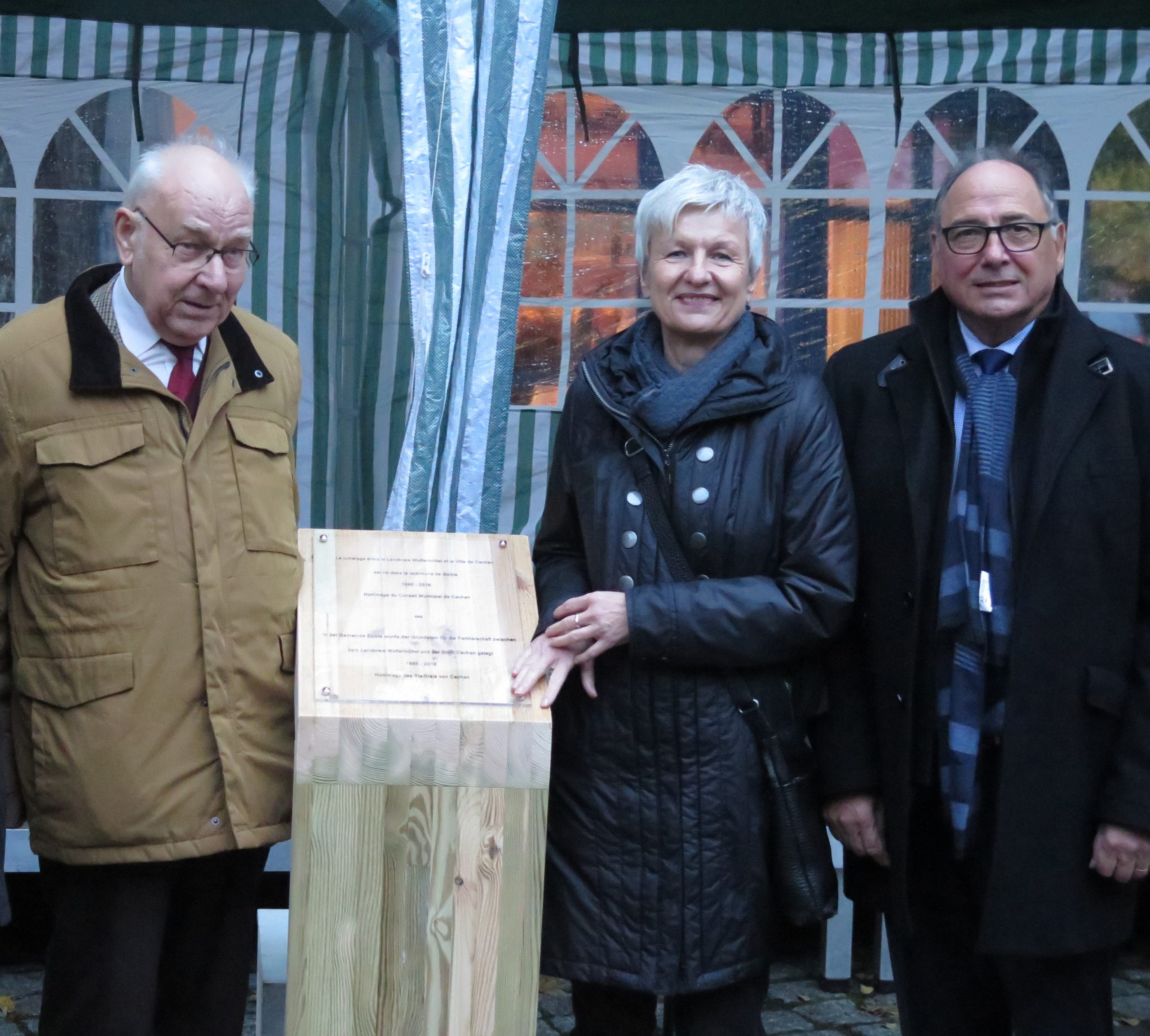 Bildunterschrift: Dieter Lorenz (l.) 2016 während der Feierlichkeiten zu 30 Jahren Partnerschaft zwischen der französischen Stadt Cachan und dem Landkreis Wolfenbüttel. Neben ihm stehen Landrätin Christiana Steinbrügge und der frühere Bürgermeister Cachans, Jean-Yves Le Bouillonnec. Fotos: Landkreis Wolfenbüttel