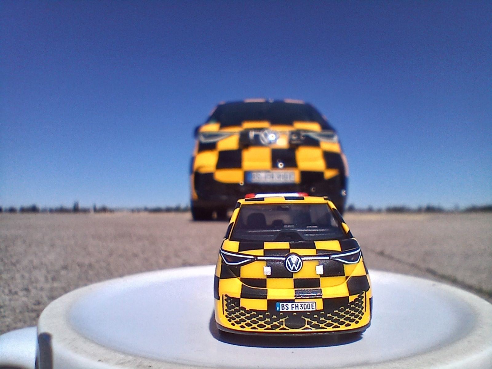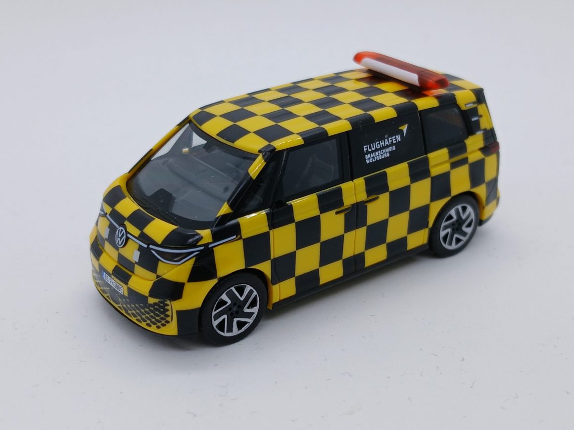 Vorbild des Modells ist ein real eingesetzter VW ID Buzz „People“ der am Flughafen Braunschweig-Wolfsburg als sogenanntes „Follow me“ Fahrzeug dient. Diese Fahrzeuge begleiten Flugzeuge sicher über das Rollfeld zu ihrer Parkposition und sind durch Ihre auffällige Gestaltung weithin sichtbar. Die Miniatur greift genau dieses Erscheinungsbild auf, eine auffällige gelb-schwarze-Karo-Optik ergänzt durch einen Warnlichtbalken, sowie originalgetreue Kennzeichen.