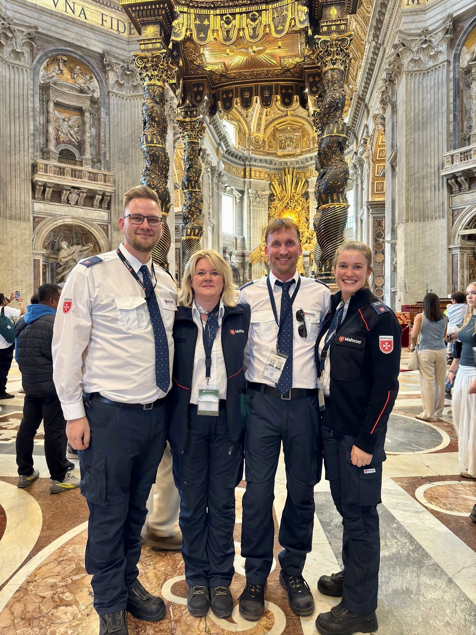 Die Helferinnen und Helfer übernahmen den Sanitätsdienst bei den vier großen päpstlichen Basiliken Roms: am Petersdom, in der Lateranbasilika (San Giovanni in Laterano), in Santa Maria Maggiore und in Sankt Paul vor den Mauern (San Paolo fuori le Mura). „Unsere Woche begann in der Basilica di San Paolo fuori le Mura – ein beeindruckender Ort“, erzählt Pia Fischer aus Hannover. Auch auf dem Petersplatz und in der Lateranbasilika erlebten die Ehrenamtlichen bewegende Momente, insbesondere während internationaler Gottesdienste. „Sogar einer deutschen Messe konnten wir kurz lauschen – das war ein schönes Stück Heimat in Rom“, berichtet Florian Lensing aus Hannover. Der Abschlussdienst in Santa Maria Maggiore wurde besonders emotional, da sich dort viele Pilgernde am Grab von Papst Franziskus versammelten.