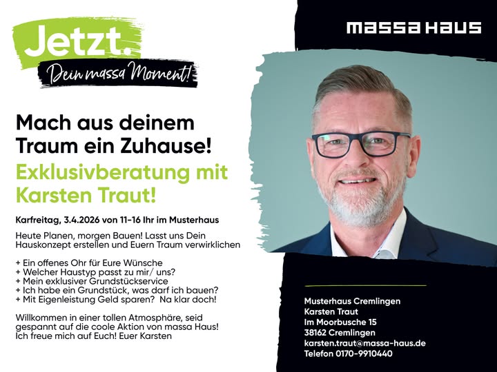 Veranstaltungen / TermineRedaktions-Tipp Massa Haus bietet Exklusivberatung in Cremlingen Von Event-Team - März 25, 2026 86 FacebookTwitterPinterestWhatsApp Massa Haus Cremlingen Anzeige