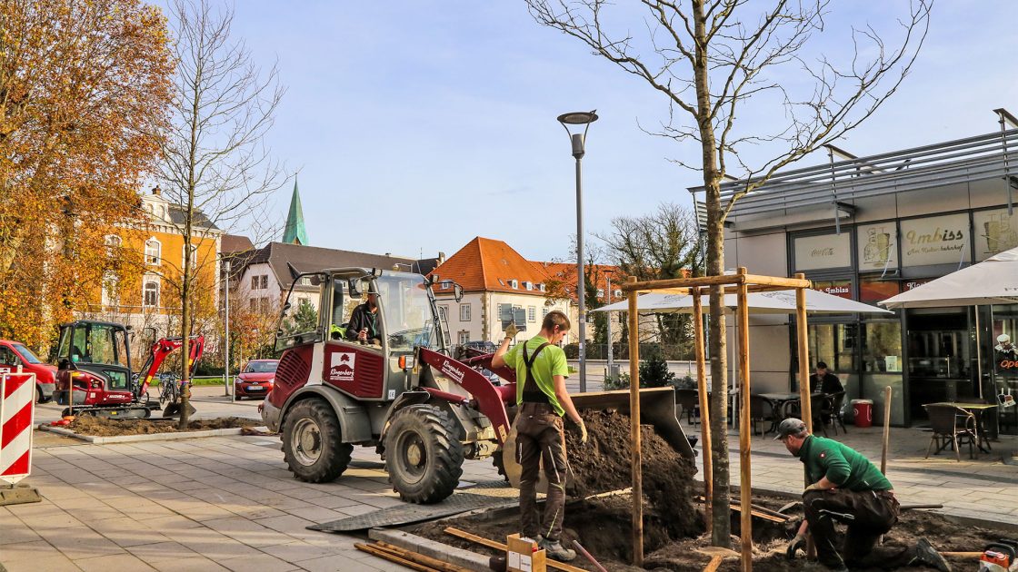 Im Rahmen der anschließenden Tiefbaumaßnahme wurden beide Baumscheiben von jeweils rund neun Quadratmetern auf knapp 17 Quadratmeter vergrößert. Die Flächen wurden bis zu einer Tiefe von 1,50 Metern ausgekoffert und mit einem speziell gemischten Baumsubstrat verfüllt. Dieses besteht aus örtlichem Oberboden, steinigem Material sowie einer Beimischung von Aktivkohle zur Verbesserung der Wasserhaltefähigkeit. Jeder neue Baum verfügt nun über einen durchwurzelbaren Raum von etwa 25 Kubikmetern – optimale Voraussetzungen für gesundes Wachstum und eine langfristige Entwicklung.