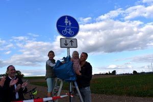(Es ist ein Radweg): Es ist ein…Radweg. Wendessener Kinder und ein Papa enthüllten das Verkehrsschild, dass den Radweg und Fußgängerweg, als Zweirichtungsweg, anzeigt.