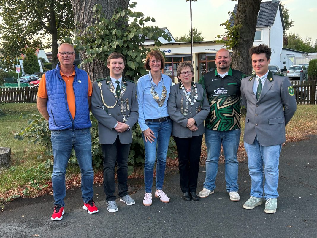 Die erste Station war bei unserer neuen Volkskönigin Nancy Langemann. Durch ein ordentliches Regenschauer dauerte der Aufenhalt etwas länger. Danach ging es dann strammen Schrittes zu unserem neuen Schützenkönig Ziya Erdal-Maco. Dieser ist erst seit seinem Volkskönig im letzten Jahr knapp ein Jahr Mitglied im Schützenverein. Ein Novum gab es dann beim nächsten Stopp am Feuerwehrgerätehaus Cremlingen. Im Zusammenschluss der Feuerwehr und der Schützen wurde in diesem Jahr eine Feuerwehrscheibe ausgeschossen. Diese sicherte sich bei der Premiere Karsten „Hofi“ Hofmeister. Nach den dort eingenommenen Erfrischungsgetränken ging es zum Auflagekönig. Hansi Gerkens sicherte sich mit einem tollen 4-Teiler diese Scheibe. Zur Auflageköniging ging es dann ins Oberdorf, wo sich Carola Stautmeister über die neue Königswürde freute.
