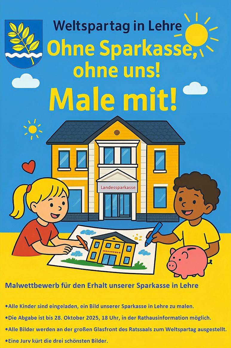 Einfach ein Bild der Sparkasse in Lehre malen und dieses bis zum 28. Oktober, 18 Uhr, an der Information im Rathaus abgeben. Die Bilder werden anschließend an der großen Glasfront des Rathauses ausgestellt. Anschließend kürt eine Jury kürt dann die drei Gewinnerbilder und deren kleine Künstlerinnen und Künstler werden mit einer Überraschung belohnt.