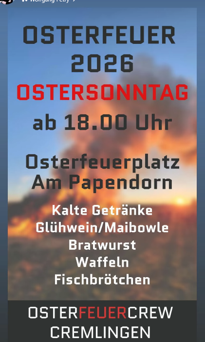 Veranstaltungen / Termine Osterfeuer im Ort Cremlingen 2026 Von Event-Team - März 24, 2026 128 FacebookTwitterPinterestWhatsApp