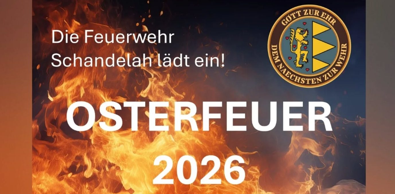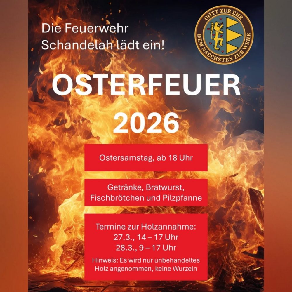 FeuerwehrenVeranstaltungen / Termine Osterfeuer in Schandelah 2026 Von Event-Team - März 8, 2026 251 FacebookTwitterPinterestWhatsApp Am Ostersamstag findet in Schandelah wieder unser traditionelles Osterfeuer statt. Die Feuerwehr Schandelah lädt euch herzlich ein und bietet euch eine große Auswahl an Essen und Getränken um euch den Abend zu verschönern.