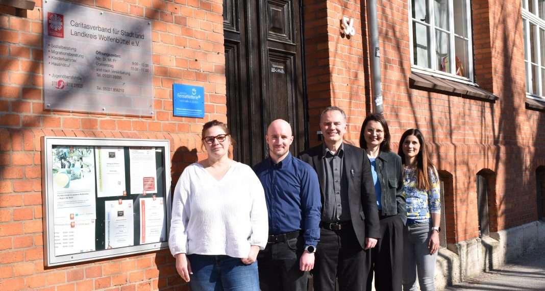 Bildunterschrift: Unterstützen junge Menschen im Landkreis Wolfenbüttel (v.l.n.r.): Cathrin Kuffner (pädagogische Fachkraft PACE), Maximilian Rothfuchs (pädagogische Fachkraft PACE), Sozialdezernent Bernd Retzki, Dr. Annett Mutke (Geschäftsführung Caritas Wolfenbüttel) und Katharina Schmitz (Jugendberufshilfe LK Wolfenbüttel). Foto: Landkreis Wolfenbüttel