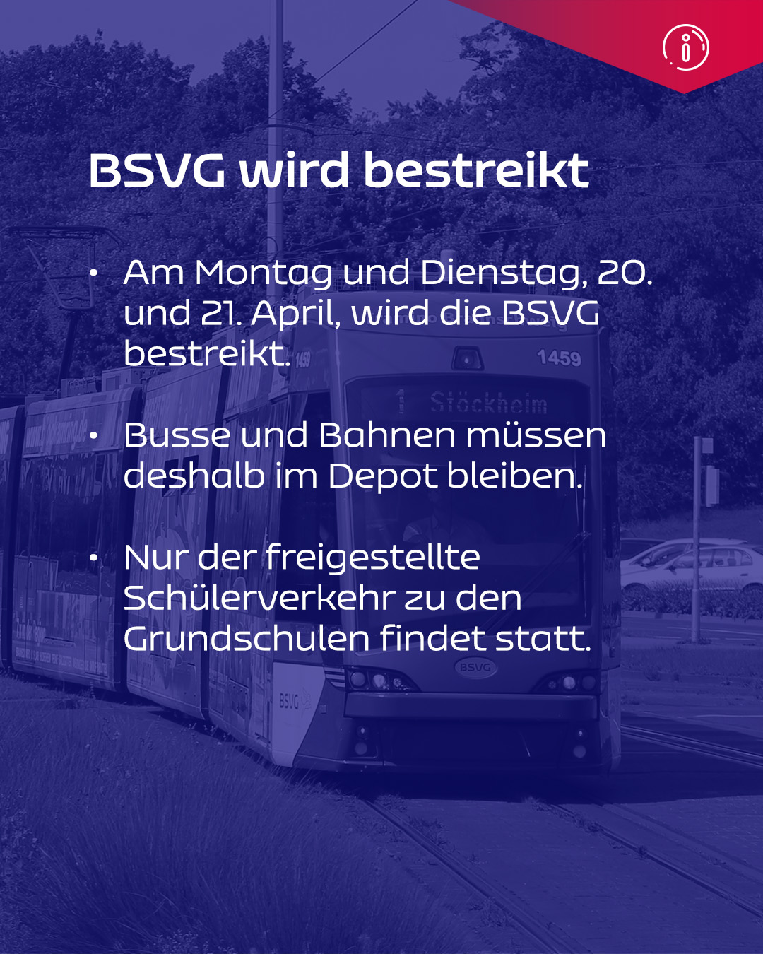 Am Montag und Dienstag, 20. und 21. April, werden wir bestreikt. Alle Fahrten der 400er-Linien und die der Stadtbahnen müssen deshalb ausfallen. Der freigestellte Schülerverkehr zu den Grundschulen findet aber wie gewohnt statt.