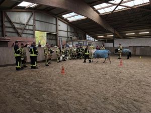 Auf Initiative des Reitvereins Lehre nahmen bei einem gemeinsamen Dienst im vergangenen November 25 Kameradinnen und Kameraden der Ortsfeuerwehren Lehre und Groß Brunsrode an einer besonderen Ausbildungseinheit teil. Ziel war es, die Reitanlage, welche aus Reithalle, Stallungen und Außengelände besteht, besser kennenzulernen und den sicheren Umgang mit Pferden im Einsatzfall zu üben.
