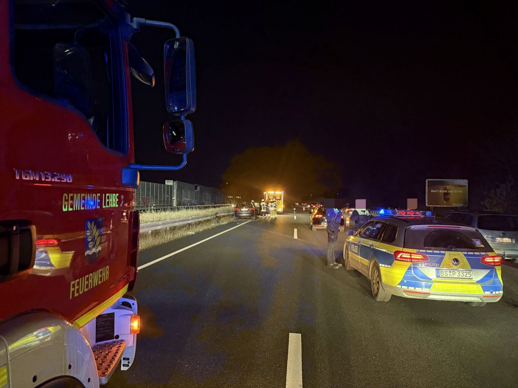 zwischen dem Autobahnkreuz WOB-Königslutter und der Anschlussstelle BS-Ost kam ein PKW nach rechts von der Fahrbahn ab und stieß in die rechte Leitplanke. Anschließend schleuderte er über alle drei Fahrbahnen und fuhr dann noch in die Mittelleitplanke, wo er schwer beschädigt stehen blieb.