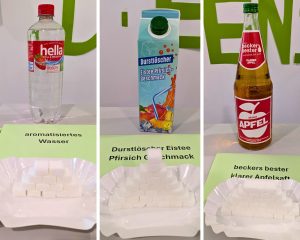 Sehr anschaulich präsentierte sich der Zahngesundheitsdienst – hier durften Interessierte gleich etwas Süßes trinken: Die Mitarbeitenden boten gesüßtes Wasser mit dem Zuckergehalt von beliebten Getränken an. Ein Liter Apfelsaft? Der Fruchtzucker entspricht 32 Stück Würfelzucker – das überraschte dann doch den einen oder anderen, zumal ein Liter gesüßten Eistees „nur“ auf 29 Stück Würfelzucker kommt. Die Mitarbeiterinnen des Zahngesundheitsdienstes sind fast täglich in den 78 Kitas und 39 Schulen im Landkreisgebiet unterwegs und führen Prophylaxemaßnahmen, Zahnuntersuchungen und Fluoridierungen durch. Spielerisch werden die Kinder schon in der Kita an das Thema Zahngesundheit herangeführt und erfahren etwas über gesunde Ernährung, richtiges Zähneputzen sowie etwas über die Entstehung von Karies.