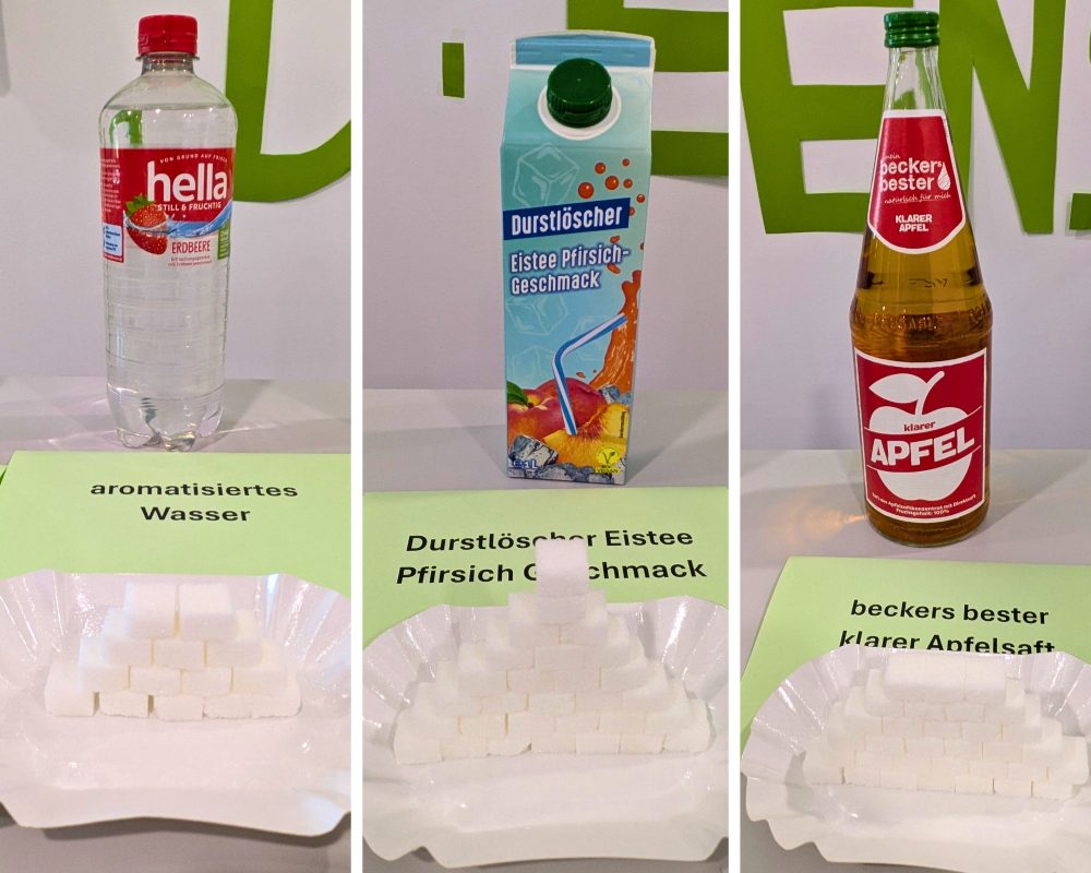 Sehr anschaulich präsentierte sich der Zahngesundheitsdienst – hier durften Interessierte gleich etwas Süßes trinken: Die Mitarbeitenden boten gesüßtes Wasser mit dem Zuckergehalt von beliebten Getränken an. Ein Liter Apfelsaft? Der Fruchtzucker entspricht 32 Stück Würfelzucker – das überraschte dann doch den einen oder anderen, zumal ein Liter gesüßten Eistees „nur“ auf 29 Stück Würfelzucker kommt. Die Mitarbeiterinnen des Zahngesundheitsdienstes sind fast täglich in den 78 Kitas und 39 Schulen im Landkreisgebiet unterwegs und führen Prophylaxemaßnahmen, Zahnuntersuchungen und Fluoridierungen durch. Spielerisch werden die Kinder schon in der Kita an das Thema Zahngesundheit herangeführt und erfahren etwas über gesunde Ernährung, richtiges Zähneputzen sowie etwas über die Entstehung von Karies.