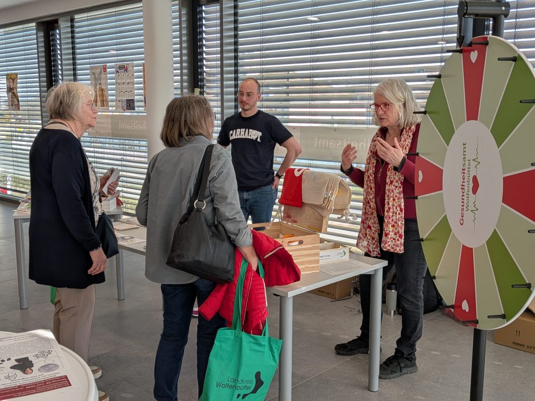 Klack, klack, klack – am Stand des Allgemeinen Sozialdienstes dreht sich das Glücksrad in roten und grünen Farben, es gibt praktische kleine Preise zu gewinnen. Zuvor gibt es noch eine Quizfrage zu einem Arbeitsbereich dieser Abteilung. Sie beraten Seniorinnen und Senioren mit gesundheitlichen Einschränkungen und deren Umfeld, führen Schwangerschaftskonfliktberatungen durch und beraten Sexarbeiterinnen und Sexarbeiter. Außerdem bieten sie unter anderem etwa kostenlose HIV-Tests an und informieren über sexuell übertragbare Erkrankungen – und das mittlerweile auch auf dem Wolfenbütteler Summertime Festival.