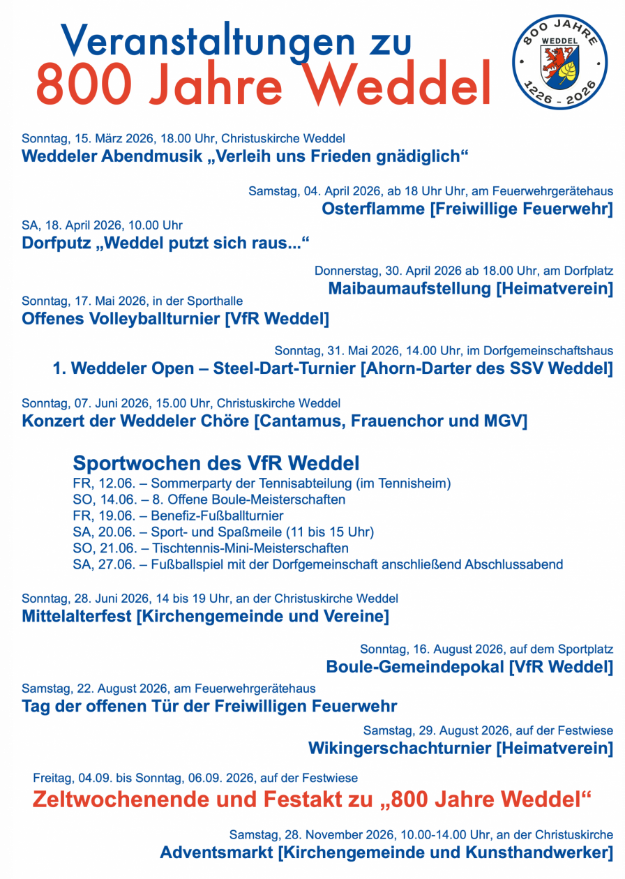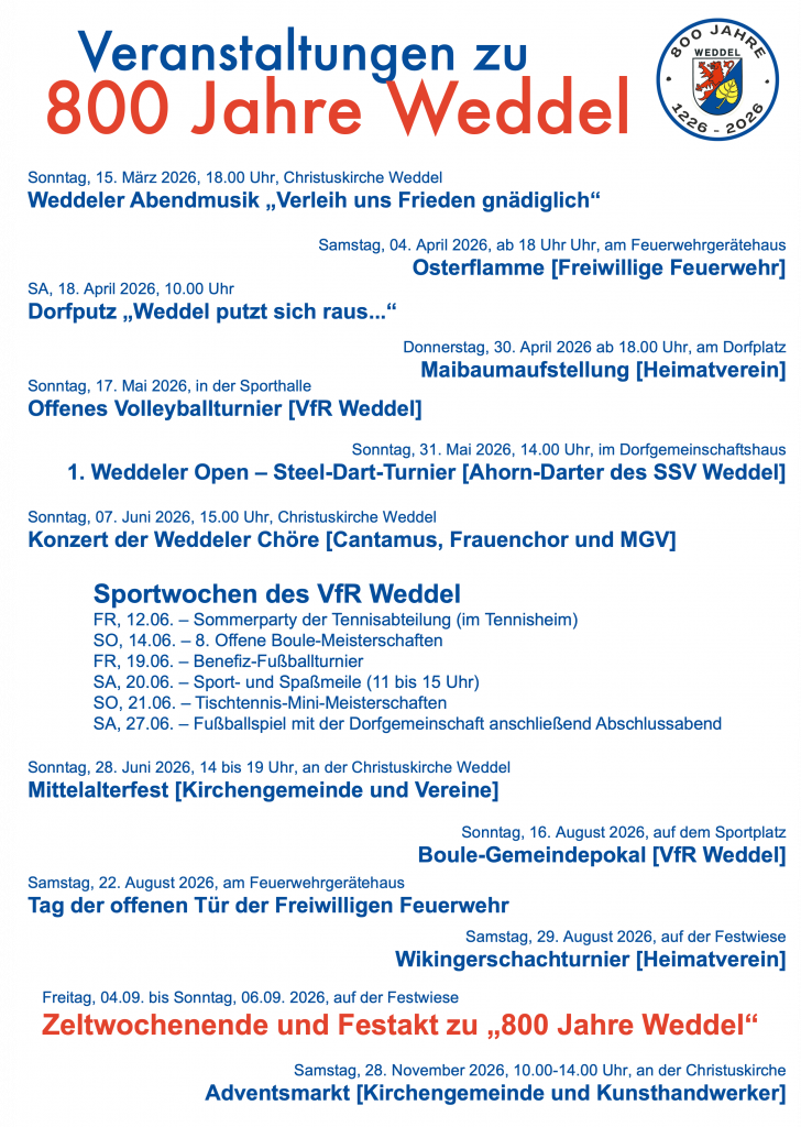 Weddel 800Events / TermineWeddel.de Weddel feiert 800 Jahre …. Von Susanne Mueller - Apr. 3, 2026 129 FacebookTwitterPinterestWhatsApp