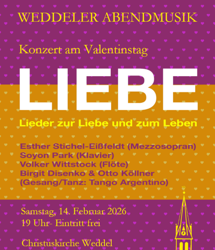 Ein spezielles Konzert zum Valentinstag – dazu lädt die Kirchengemeinde der Christuskirche Weddel herzlich zur ersten Weddeler Abendmusik ein am Samstag, 14. Februar, 19 Uhr. Und was könnte es am Valentinstag für ein anderes Thema als die Liebe geben? Die Liebe in all ihren Facetten hat seit Jahrhunderten Komponisten zu den schönsten Kompositionen inspiriert. An diesem Abend werden Werke aus dem europäischen, US-amerikanischen und südamerikanischen Kulturkreis zu hören sein. Aus der Romantik sind Clara und Robert Schumann mit Liedern ebenso vertreten wie Franz Schubert, aus Frankreich stoßen Jean-Paul Martini mit seinem berühmten klassischen „Plaisir d’Amour“ und der Romantiker Gabriel Fauré hinzu. Italienische Renaissance mit Gulie Caccini und nordische Romantik mit Edvard Grieg bringen weitere Farben ins Spiel. Der amerikanische Kontinent ist mit populären Songs von Leonard Bernstein und Stevie Wonder aus dem Norden und argentinischer Tangomusik aus dem Süden dabei. Und da wundert es auch nicht, wenn plötzlich das Tanzbein geschwungen wird und man sich mitten in Buenos Aires auf der Straße befindet. Dieses spannende Programm wird gestaltet durch Esther Stichel-Eißfeldt (Mezzosopran), Soyon Park (Klavier), Volker Wittstock (Flöte), Birgit Disenko/Otto Köllner (Gesang/Tanz Tango Argentino). Der Eintritt ist frei.