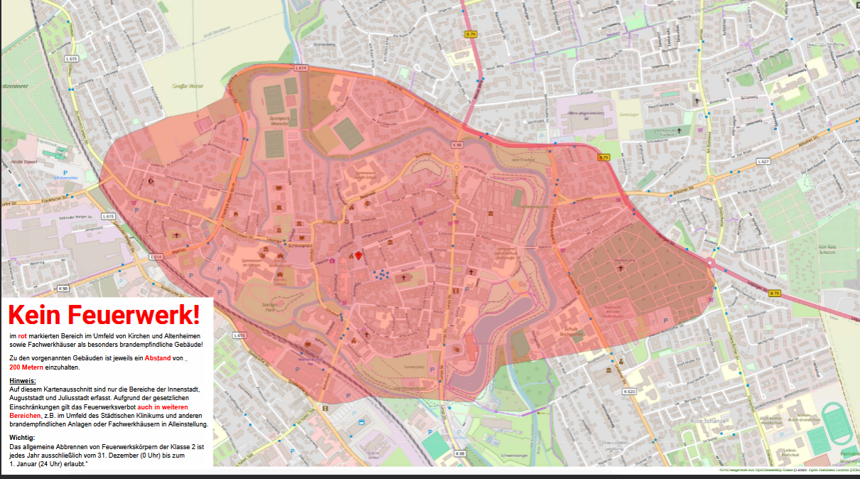 Für die Innenstadt Wolfenbüttels mit ihrer überwiegend aus Fachwerkbauten bestehenden Bausubstanz geht eine verstärkte Brandgefahr durch Silvesterfeuerwerk aus. Für die Stadt Wolfenbüttel bedeutet diese gesetzliche Regelung ein Verbot des Silvesterfeuerwerks in der gesamten Innenstadt einschließlich der August- und Juliusstadt (s. beigefügten Kartenausschnitt).